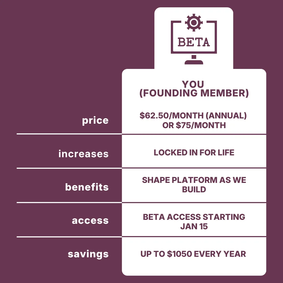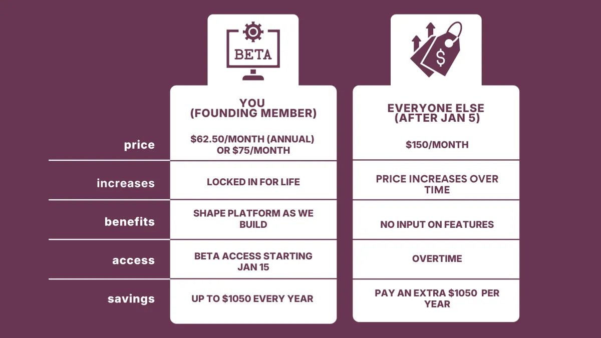 Why this matters: You're locking in $75/month pricing FOR LIFE while helping create exactly what coaches need. By the time we hit $150/month regular pricing, the platform will be fully built—and you'll have paid $75 the whole time.