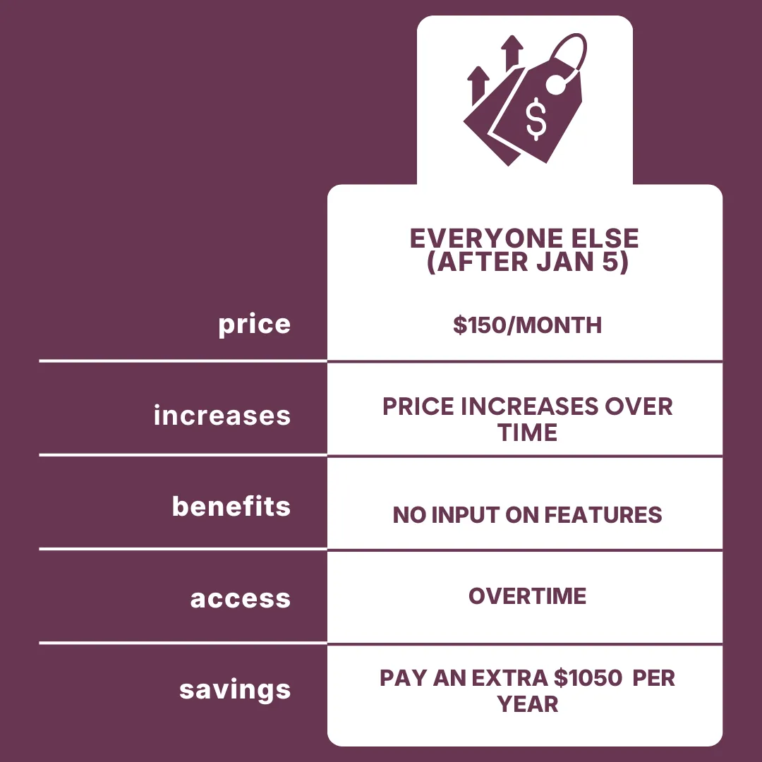 $75/month locked FOR LIFE - Never increases (regular price $150/month after Jan 15).